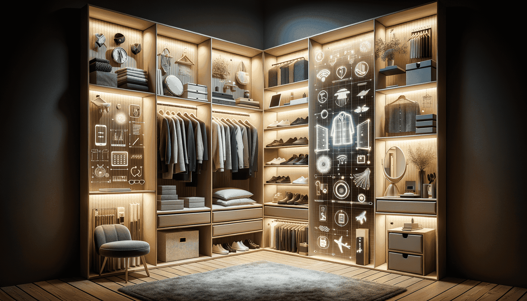 Для тех, кто привык к роскоши и комфорту, важно, чтобы аксессуары гардеробной были не только красивыми, но и практичными. Системы автоматического освещения, датчики движения, встроенные системы увлажнения и освежения воздуха – все это повысит удобство использования гардероба и сохранит вещи в идеальном состоянии.