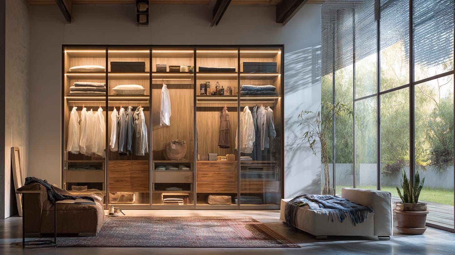 Здесь важно не забыть: не всё новое создано только для модного шоу-рума. Некоторые архитектурные приёмы — такие как гардеробные системы с подсветкой или решения в потолок — прекрасно реализуются в ваших реальных комнатах. При правильном подходе открытые гардеробные системы могут не только справляться с проблемой углов, но и помочь организовать тот самый «растворяющийся интерьер».