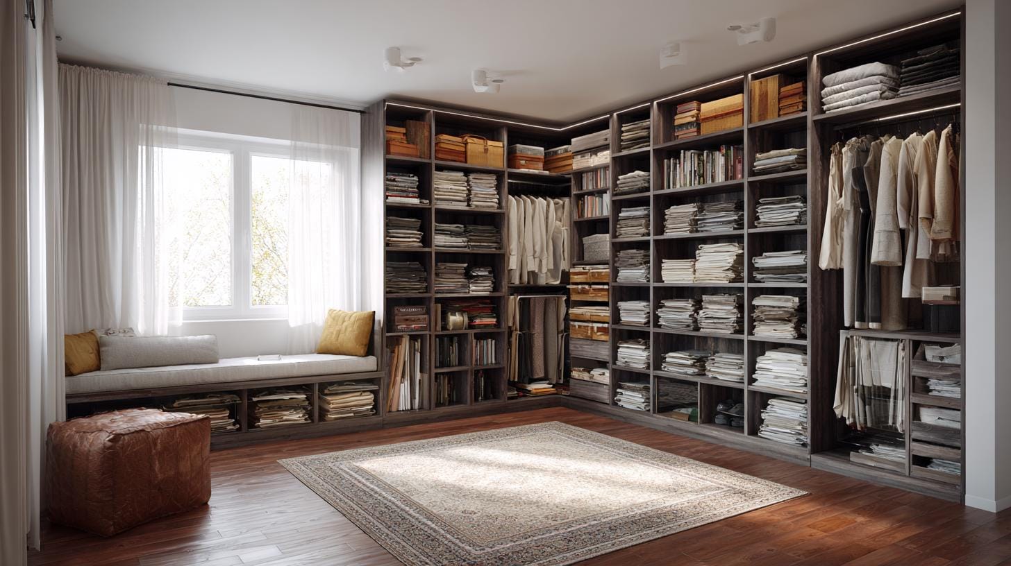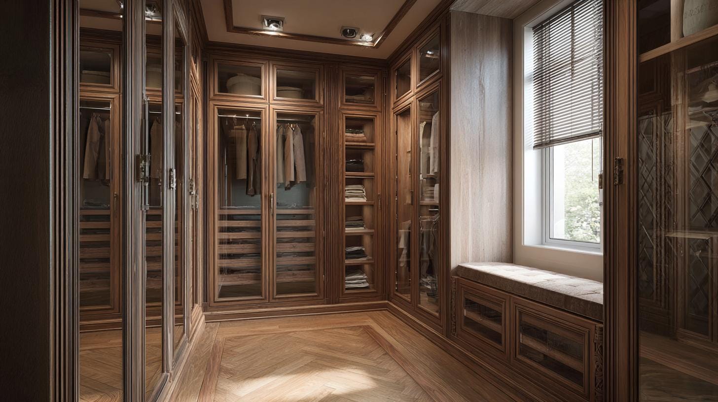 | L-образная (угловая) гардеробная комната | Максимальное использование угла, удобный доступ, вариации открытого/закрытого хранения | Не так проста в самостоятельном проектировании, нужна точность расчёта |