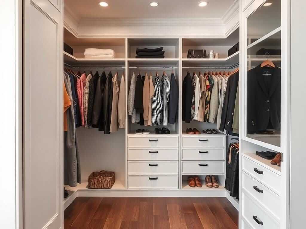 Гардеробная комната средней площадиКомбинация ящиков, полок, штанг, возможно, зеркалаРазнообразие хранения, визуальный контрольЭкспериментируйте с расположением