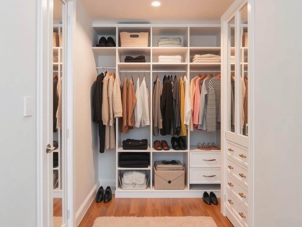 Отдельным лайфхаком можно назвать простое правило: при организации гардеробной комнаты всегда держите перед глазами принцип «три зоны» — верхняя, средняя и нижняя. Верхняя — для редко используемых вещей, средняя — для вещей повседневного использования, нижняя — для обуви и аксессуаров. Такой подход экономит время и нервы — каждое утро вещь «встречает» вас на привычном месте.