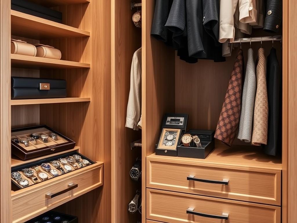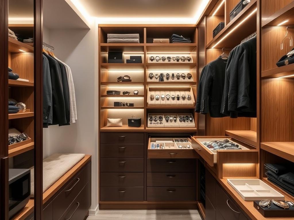 Интеграция системы хранения для часов в современный дизайн гардеробной