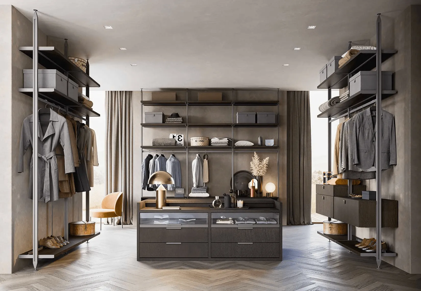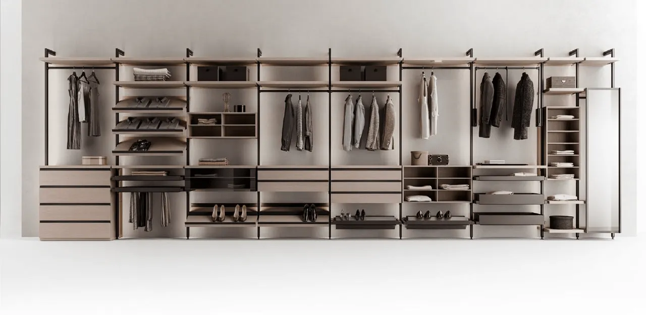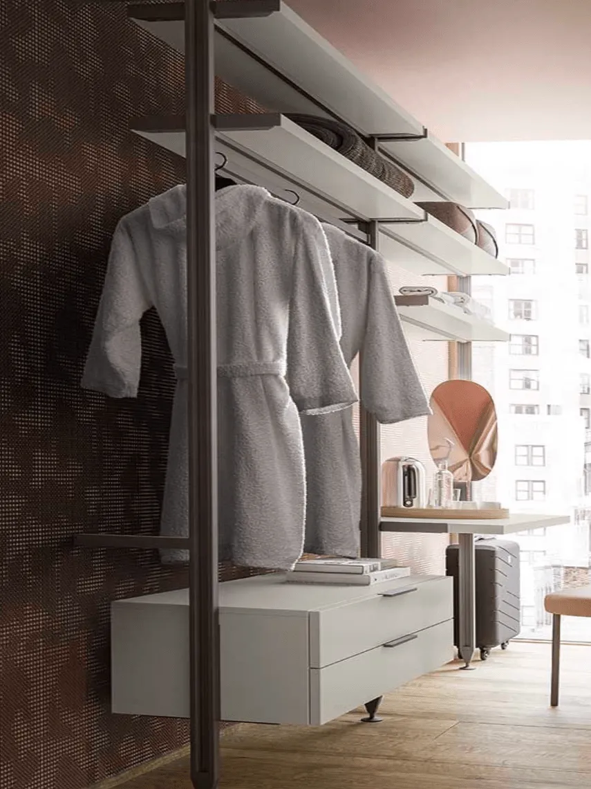 Оригинальный плюс таких систем — абсолютная гибкость. Все элементы разбиваются по высоте, легко корректируются, подстраиваются под размер вещей, меняются местами при малейшей смене гардероба. При переезде эту систему можно демонтировать и собрать в новой квартире буквально за вечер — ни малейшего следа на стенах, никаких «заплаток» обоям и сердитого взгляда хозяев. Звучит неожиданно современно, но не так ли хотят жить те, кто движется сквозь мегаполис с легкостью, а не с усталостью?