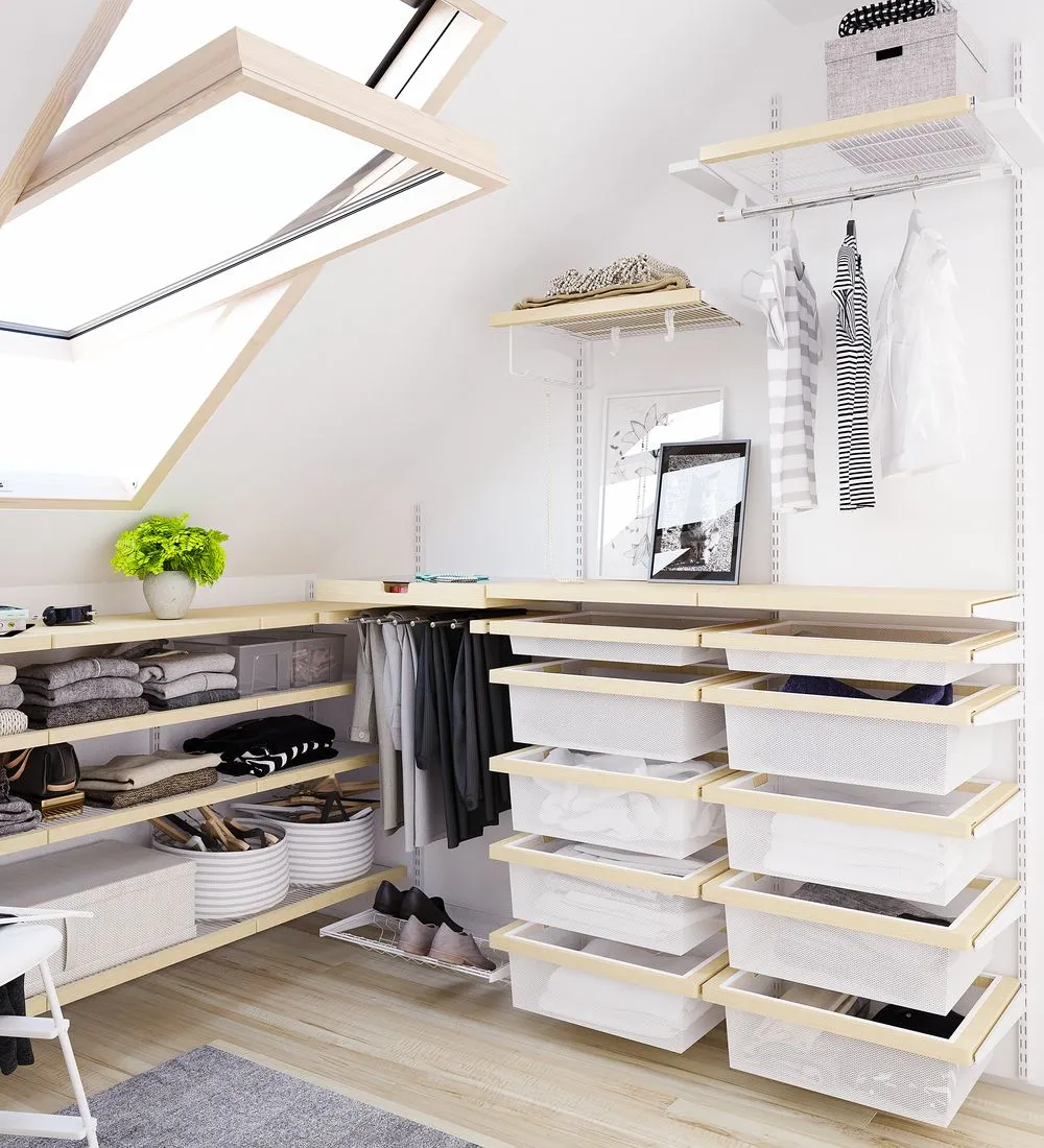 - Типы вещей, которые вы планируете хранить: определите, какие элементы системы вам понадобятся (полки, вешалки, ящики, корзины).
