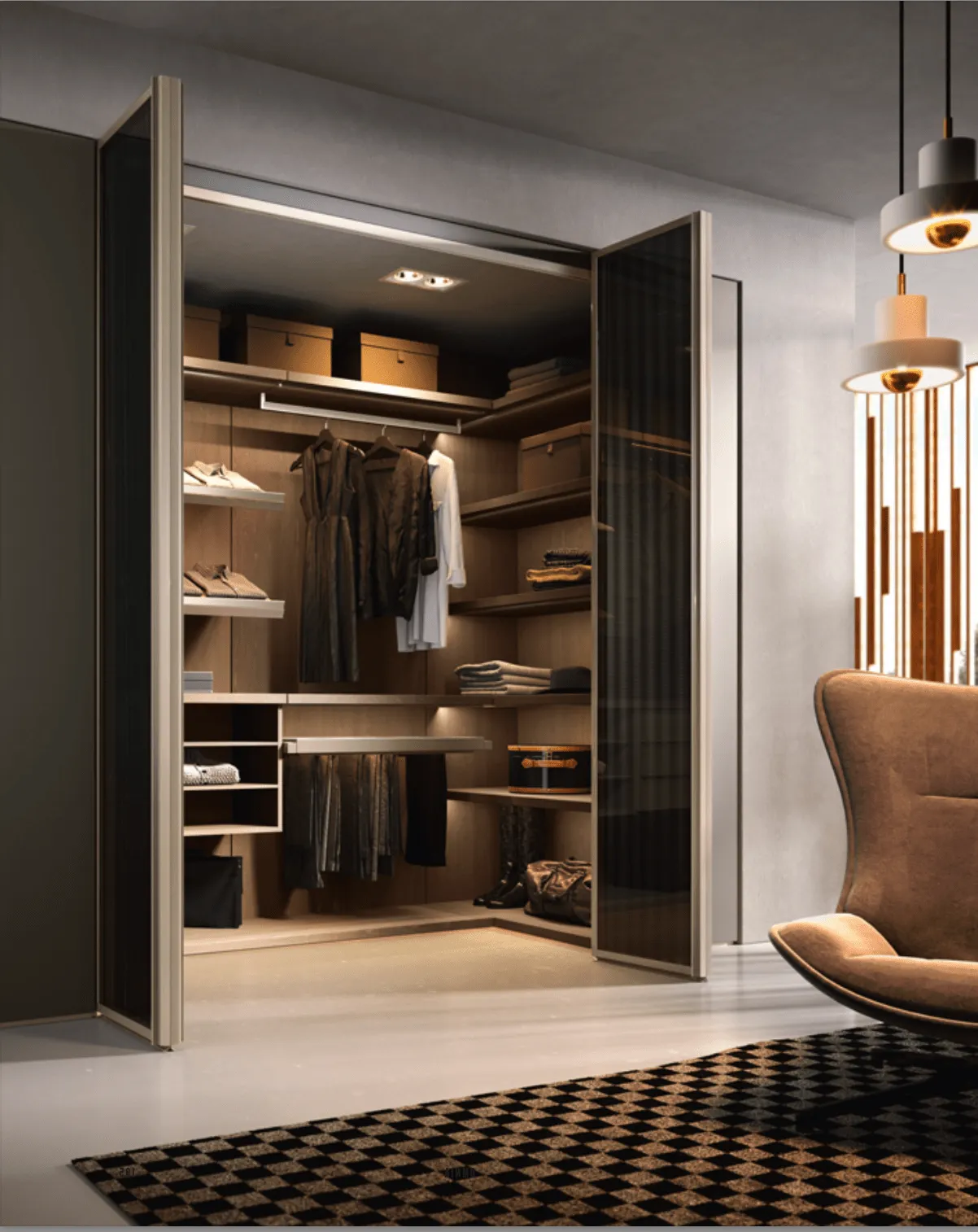 3. **Освещение**: Обеспечьте хорошее освещение, чтобы легко находить нужные вещи. Используйте светодиодные ленты и точечные светильники.