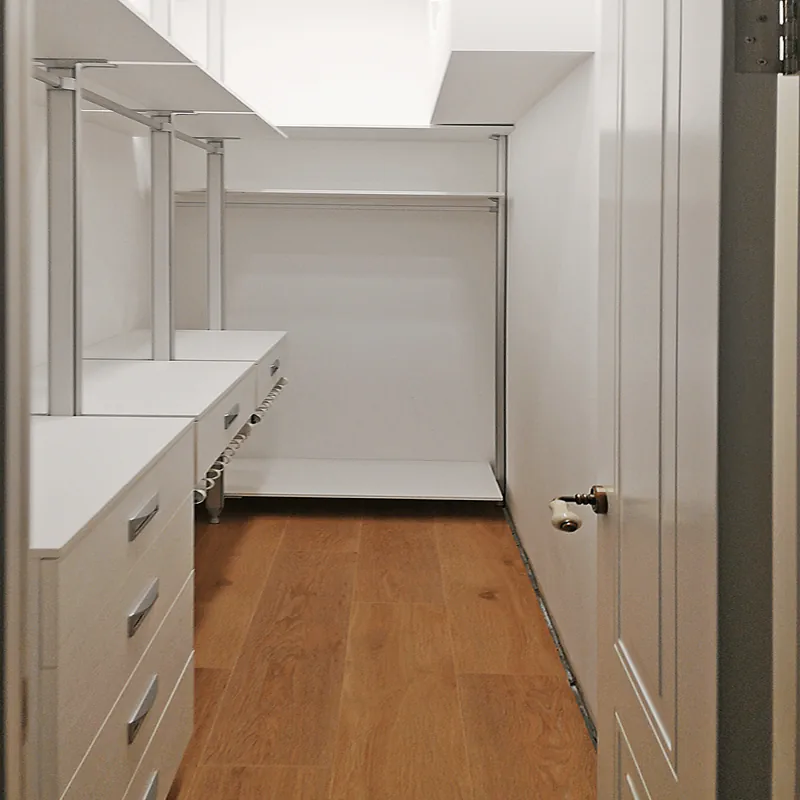 Пример: Пожилая пара Сидоровых организовала свою гардеробную stilos с использованием выдвижных ящиков и полок. Часто используемые вещи размещены на уровне глаз и рук, а сезонная одежда хранится в отдельных зонах.