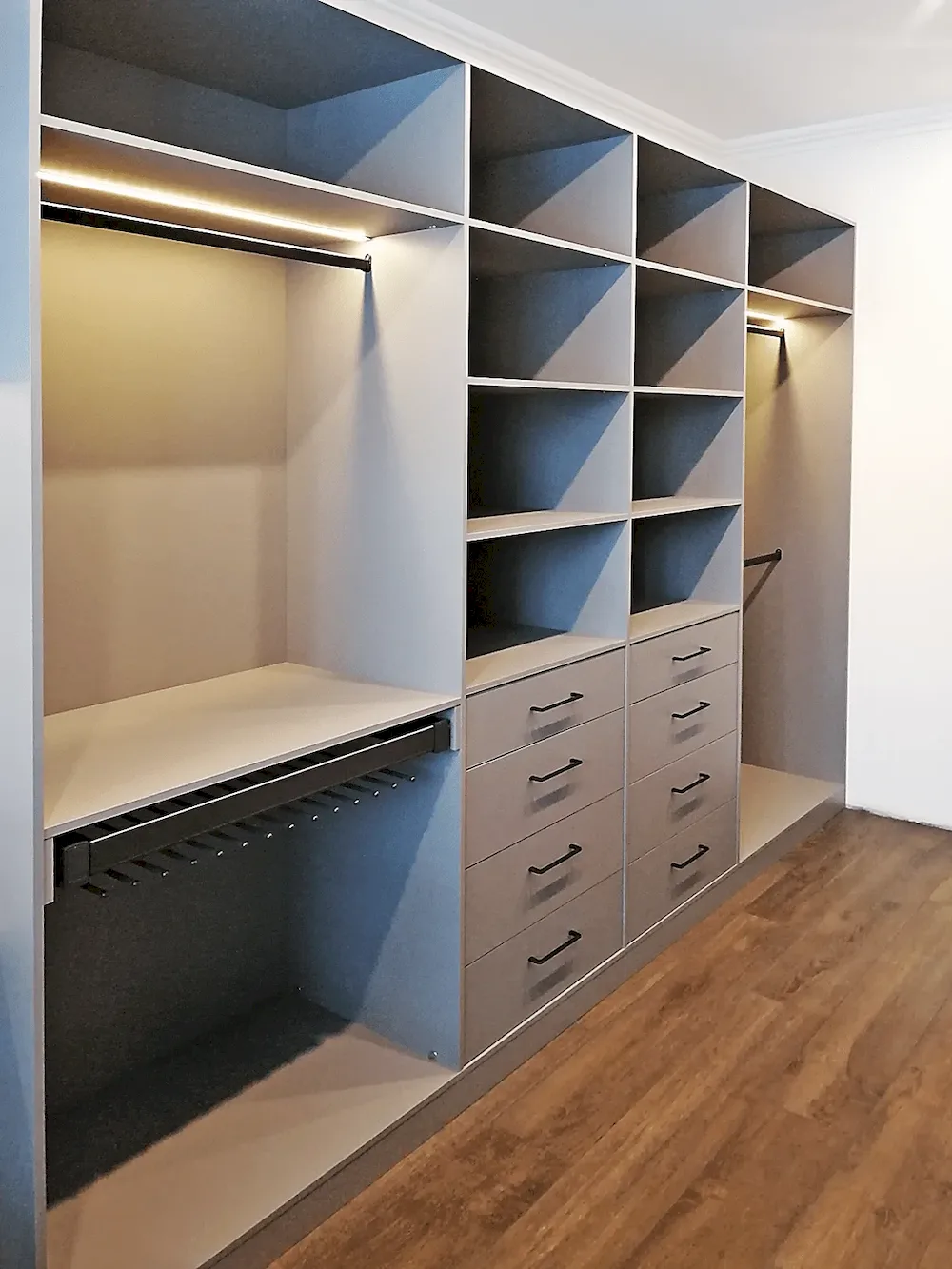 Встроенные шкафы могут быть оснащены различными дополнительными опциями для повышения удобства и функциональности:
