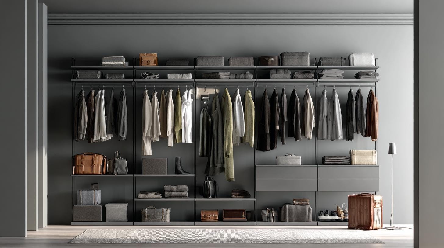 И вот тут в игру вступает другое поколение решений — гардеробные системы без шкафа. Это как раз тот случай, когда алюминий и лёгкость не только про эстетику — они про функциональность. Гардеробная система с алюминиевым профилем фактически убирает боковины и задние стенки, «отпуская» стены комнаты, не навязывая стандартную коробку. Когда впервые попал на производство систем Poliform и Rimadesio (было это ещё в начале 2010-х), меня поразила итальянская лёгкость замысла. Всё видно, всё рукоподатно, всё продумано до деталей: и как подсветка не режет глаз, а мягко вырисовывает контуры, и как алюминий держит полки в абсолютной тишине. Парящие пространства вместо лабиринта полок! Впрочем, пусть имя не смущает: хорошую открытую гардеробную систему сегодня может позволить себе не только домовладелец на озере Комо. Посмотрим честно: Poliform, Rimadesio, Mixal, RaumPlus — каждая из этих систем задала определённый эталон стиля. У Rimadesio минимальный алюминиевый профиль растворяется в воздухе, у Poliform не меньше эстетики в креплениях и подсветке, RaumPlus играет на универсальности форм, а MixaI ловко балансирует между ценой и качеством. Недостаток разве что один — жёсткая стандартизация, а индивидуальность возможна, но за серьёзную надбавку к цене. Но здесь и появляется пространство для осознанного выбора. Если интегрировать алюминиевые опорные стойки — решение, на котором держатся многие гардеробные системы в потолок — мы словно «стирать» границы и заодно решаем проблему угла: никакие теневые зоны, никакие перекрёстные стелажи, никакой борьбы за каждый сантиметр глубины. Встраиваясь буквально в архитектуру комнаты, такая конструкция строит вокруг ваших вещей элегантную сцену. Вы двигаетесь, подстраиваете, дополняете, убираете. Причём система может быть и с подсветкой, и без фасадов — по проекту, а не по рекламной фотографии из каталога. Отдельная интрига: подобные системы в нишу или с дополнительными элементами по размеру действительно проектируются под сценарии жизни, а не в расчёте на одну-единственную логистику вещей.