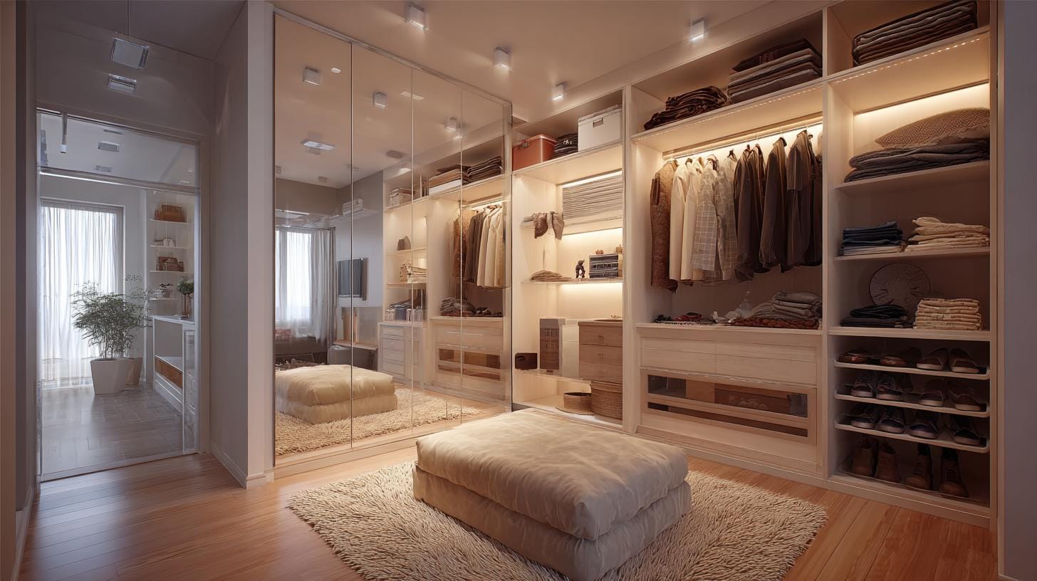 Важно помнить, что зеркало в гардеробной или рядом с ней значительно улучшает удобство — оно визуально расширяет пространство и помогает быстро оценить образ.