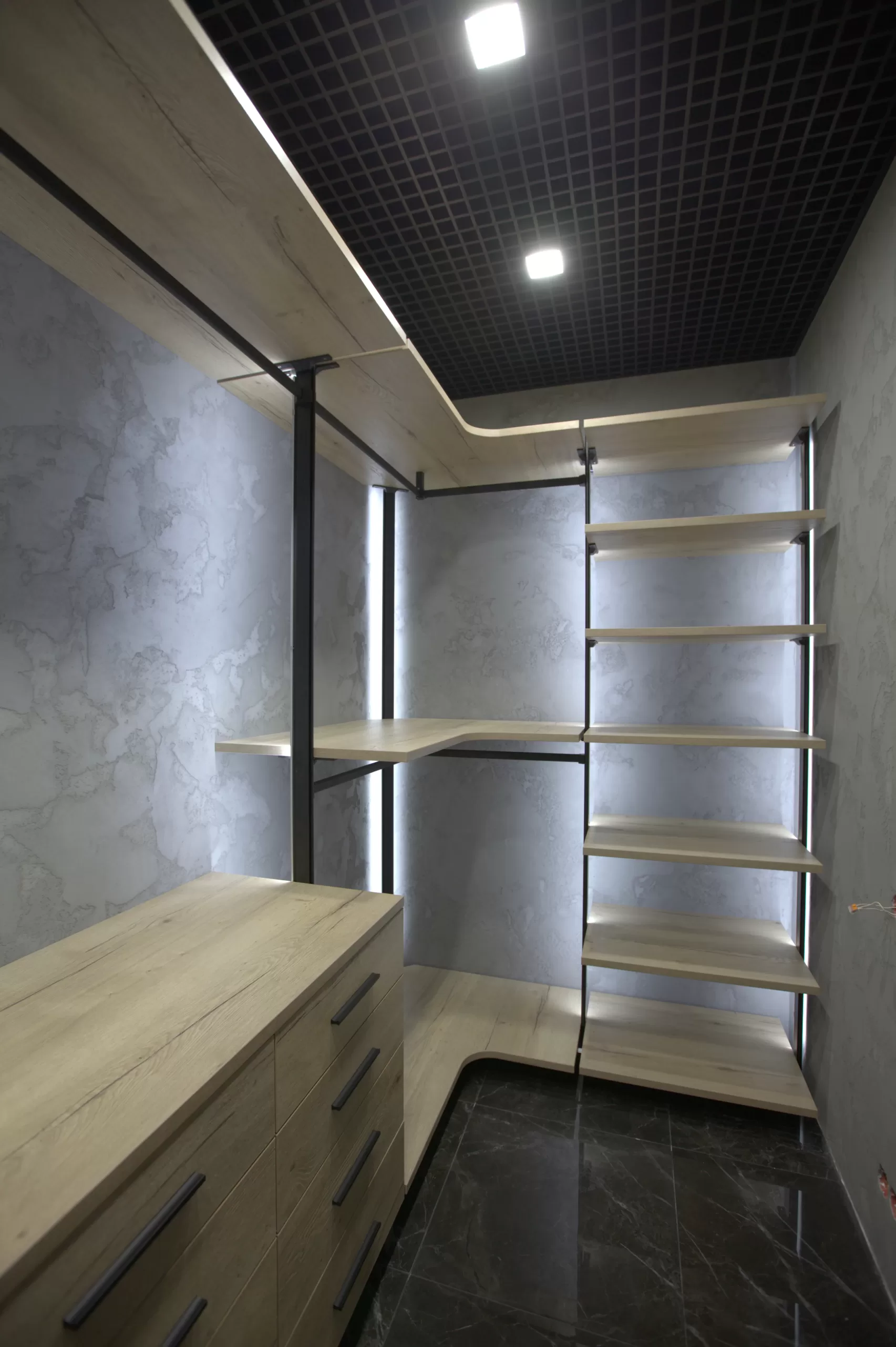 Второе преимущество — индивидуальный дизайн. Клиент может выбрать материалы, цвета, фурнитуру, что позволяет создать уникальное пространство, полностью соответствующее личным предпочтениям и образу жизни. Например, для коллекционера дорогих часов может быть предусмотрен специальный сейф, а для любителя вечерних нарядов — отдельная зона с подсветкой для вечерних платьев.