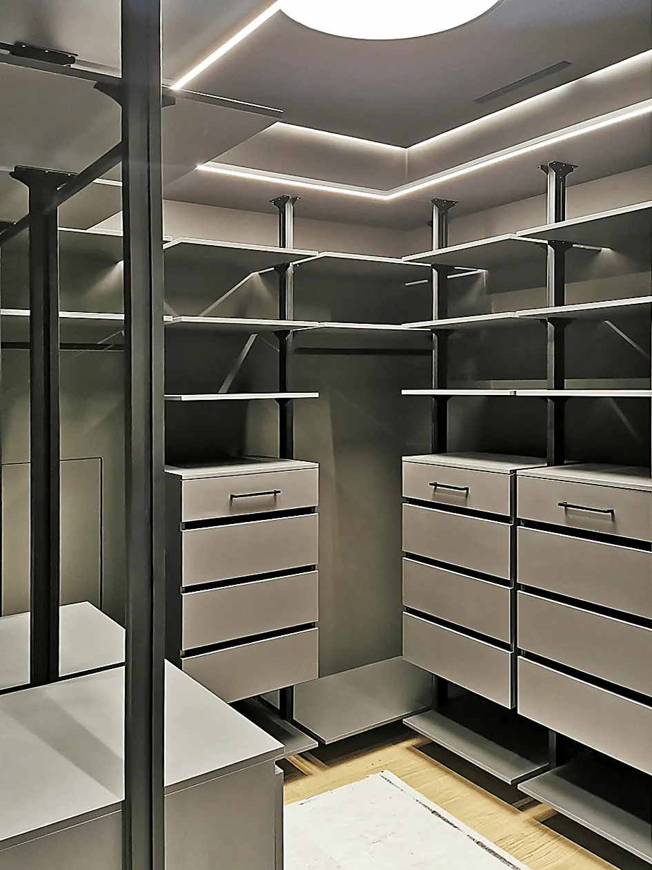 4. **Освещение**: Установите освещение внутри гардеробной системы, чтобы легко находить нужные вещи даже в темное время суток. Используйте светодиодные ленты или встроенные светильники.