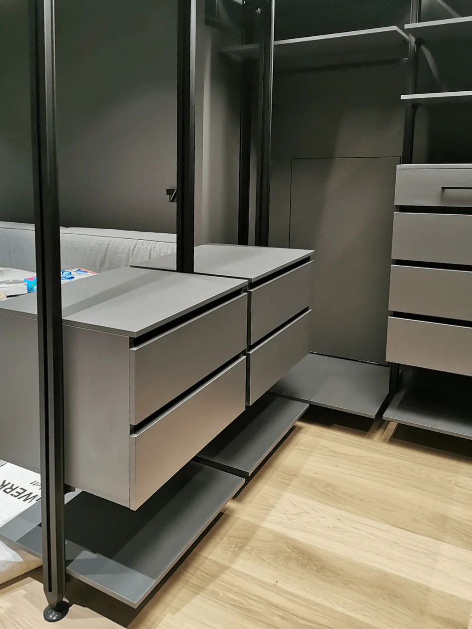 Гардеробная система Vitra включает в себя различные модули, такие как полки, вешалки, ящики, корзины и другие элементы. Каждый модуль можно настроить по ширине, высоте и глубине, чтобы идеально вписаться в ваше пространство.