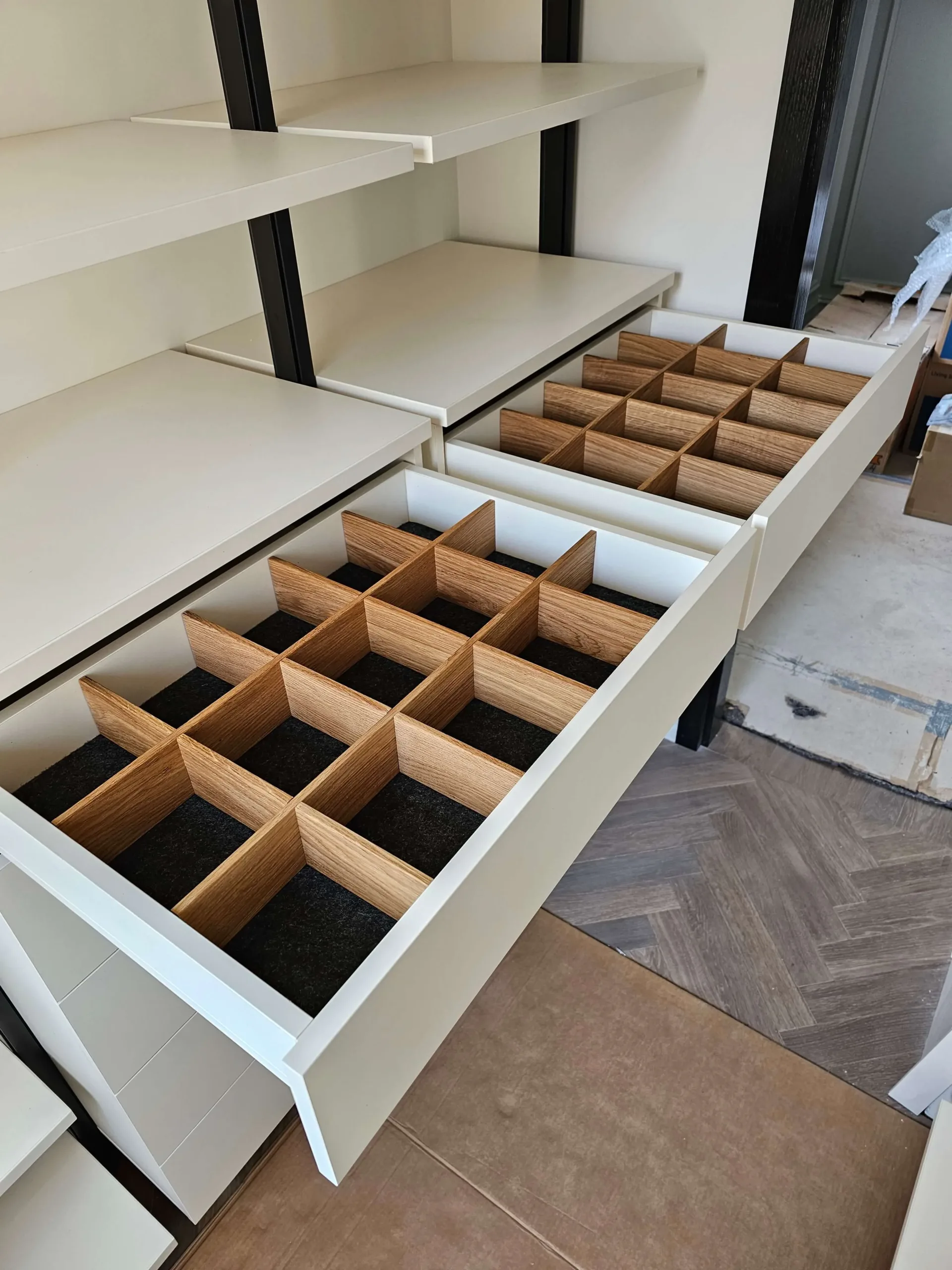 4.3. Встроенные ящики. Добавьте встроенные ящики для хранения аксессуаров, таких как галстуки, ремни и часы. Это поможет поддерживать порядок и упростит доступ к ним.