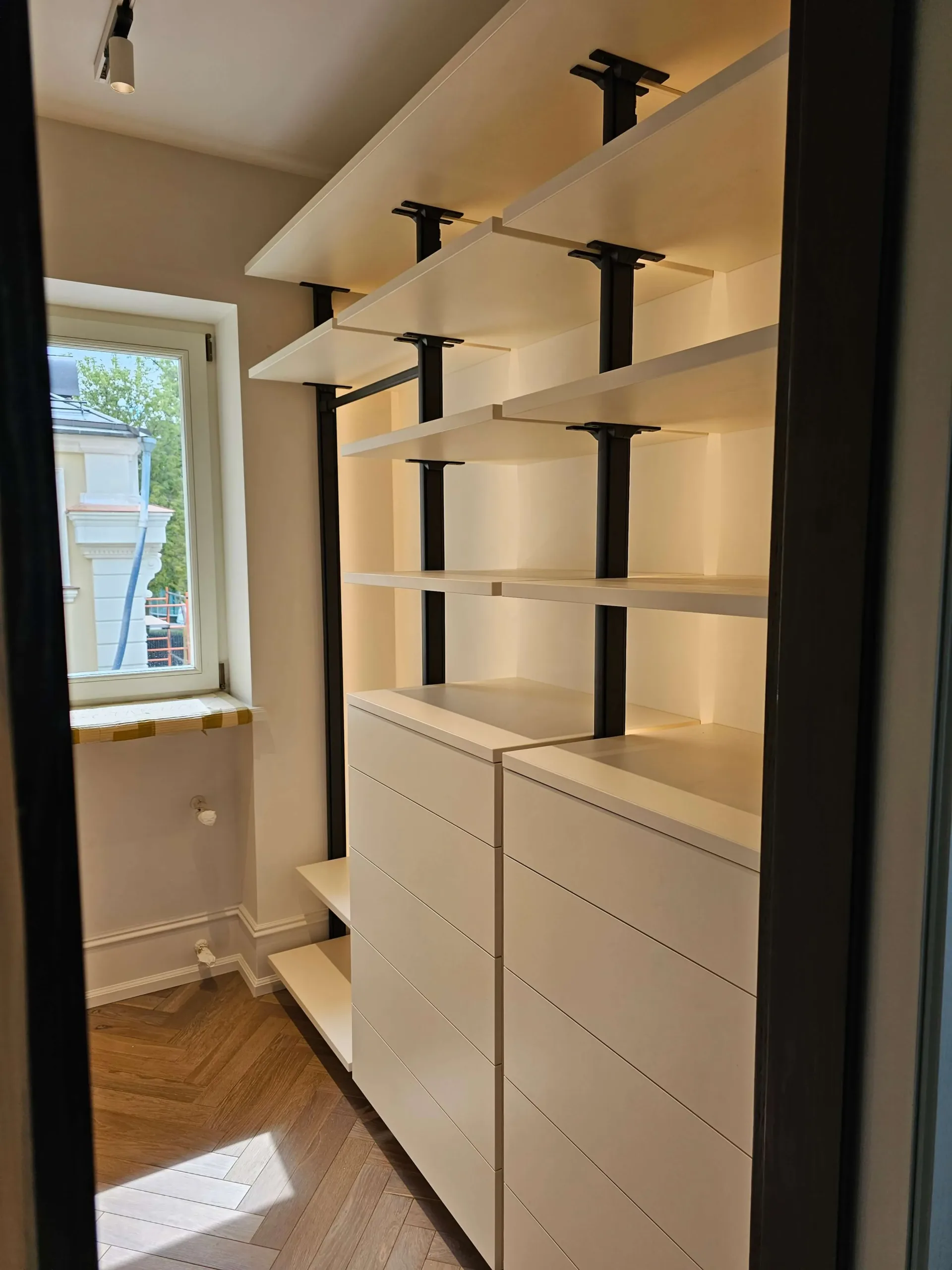 7.4. Автоматизация. Рассмотрите возможность установки автоматических систем, таких как выдвижные полки и вешалки. Это упростит использование гардеробной системы гардеробной системы.