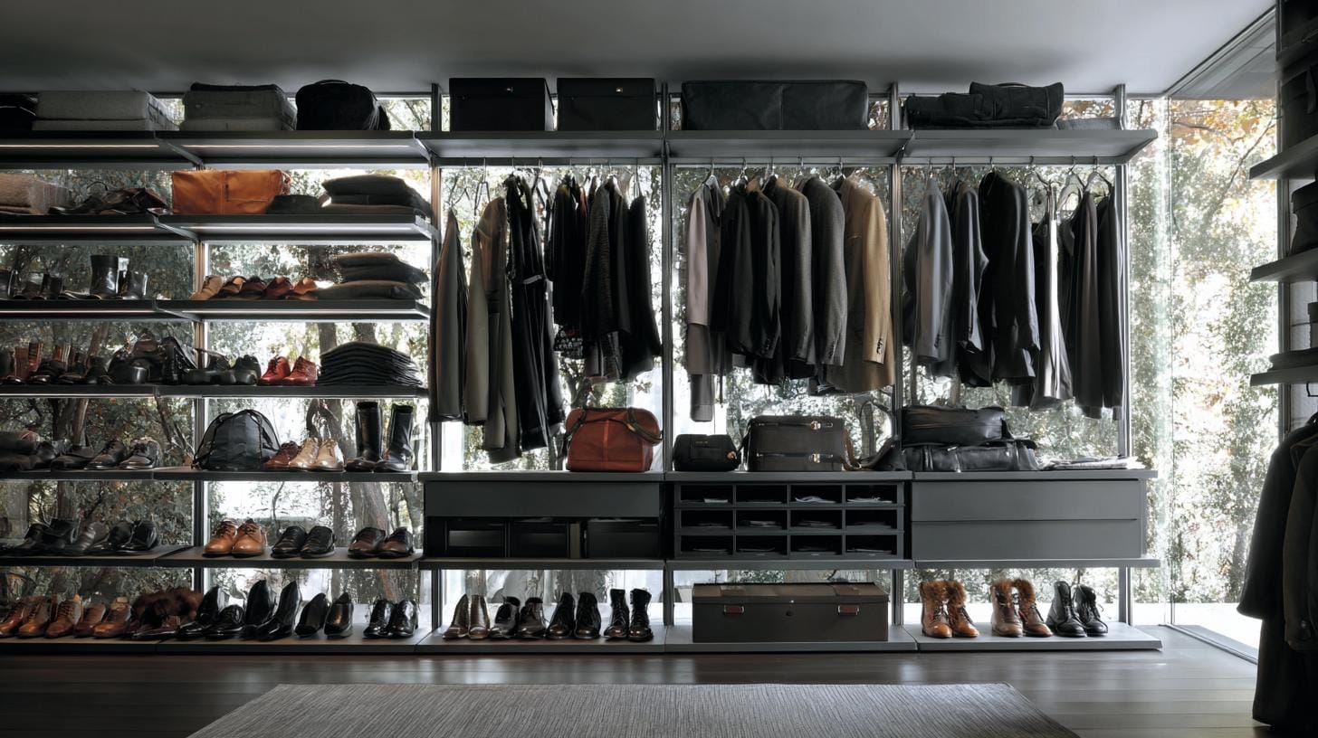 Открытая гардеробная система, например тип Rimadesio Zenit, снимает с себя все эти проблемы как со старой сценографии. Всё на виду, все уровни продуманы, аксессуары и обувь аккуратно распределены. Это не просто красиво — это удобно. Преимущества видны сразу: лёгкий доступ к вещам, быстрый обзор, естественная вентиляция и возможность гибкой перестройки конфигурации.