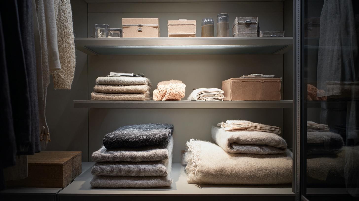 - Используйте верхние зоны для несезонных вещей в компактных чехлах — они не мешают и защищают ткани.