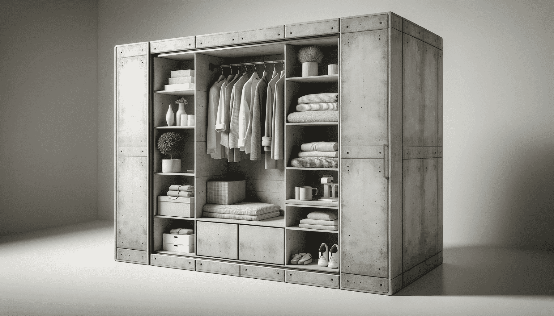 2. **Организация хранения**: Используйте шкаф купе под бетон для хранения одежды, обуви и аксессуаров. Это поможет поддерживать порядок и чистоту в доме, а также упростит доступ к вещам.