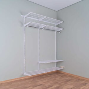 Серая гардеробная №13 повторяет функционал белой, но выглядит строже и более технологично. Брючница бережно хранит деловые брюки и джинсы, освобождая основную штангу для пиджаков, сорочек и верхней одежды. Неглубокая корзина помогает держать в порядке домашние вещи, спорт и аксессуары, которые обычно скапливаются в одном хаотичном ящике. Полки разной длины дают возможность выстроить удобную лестницу хранения: внизу — обувь и тяжёлые коробки, выше — трикотаж и повседневные комплекты. Серый металл хорошо скрывает следы эксплуатации и идеально сочетается с нейтральной отделкой стен. Такой модуль органично вписывается в гардеробную комнату в стиле минимализм, кабинет или гостевую зону.