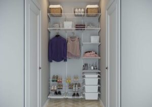 Расширенный стеллаж ARISTO для домашнего офиса на два рабочих места: широкие полки-столешницы, сетчатые корзины и навесные полки для бумаг и книг. Идеален для детской, кабинета или балкона, где нужно компактно организовать зонy работы и учёбы.