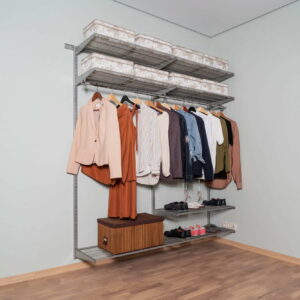 Женская гардеробная ARISTO 128×45×240 представляет собой лёгкую металлическую систему с полками и зонами для аксессуаров и делает прихожую или спальню светлым удобным пространством.
