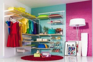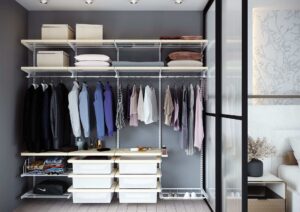Открытая гардеробная система хранения из дерева и металла для организации пространства