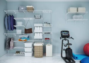 Система хранения ARISTO 230×45×240 для комнаты с тренажёром объединяет полки и корзин...