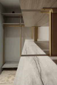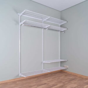 Эффективная система хранения для гардеробной или спальни с плавно скользящими дверями на подвесном механизме, не требующем нижней направляющей и сохраняющем напольное покрытие. Размер 280×15×280 см позволяет разместить до 30 вещей на плечиках, 25 на полках, 10 пар обуви и аксессуары в удобных ячейках. Комбинация профиля цвета темной бронзы и мебельных плит с разными текстурами гармонично впишется в современный интерьер, обеспечивая порядок и легкий доступ ко всем вещам.