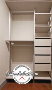 Гардеробная в нише 138×230 см: сетчатые полки и полки с разделителями, выдвижные корз...