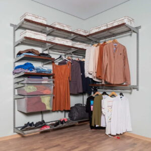 Угловая гардеробная система ARISTO 230×130×230: открытые металлические полки и навесн...