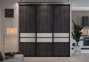 Элегантный шкаф-купе для спальни с глянцевым стеклом и вставкой из натурального шпона...