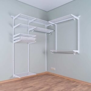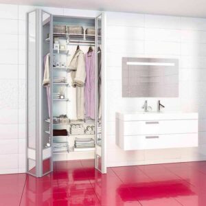 Внутреннее наполнение может быть выбрано на основе гардеробной системы ARISTO с сетчатыми стальными полками и корзинами или из ЛДСП с полками и выдвижными ящиками. Вы также можете выбрать цвет профиля и ручек для дверей, что добавляет дополнительную гибкость в дизайне.