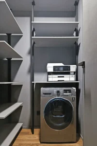 Функциональная гардеробная-постирочная на базе системы Vitra с черными профилями идеа...