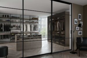 Элегантная гардеробная система с раздвижными дверями из тонированного стекла и профил...