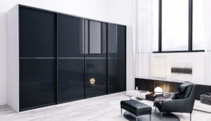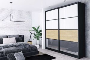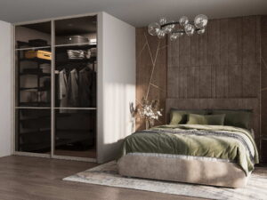 Элегантный шкаф-купе для спальни или гостиной с фасадами из шпона и черного матового ...