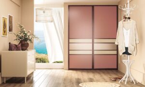 Элегантный корпусный шкаф в розовых и бежевых тонах станет гармоничным акцентом спаль...