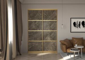 Элегантный встроенный шкаф-купе для спальни или гостиной с фасадами из серого мрамора...