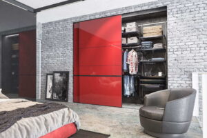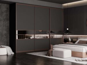 Элегантный шкаф-купе для спальни с глянцевым стеклом и вставкой из натурального шпона...