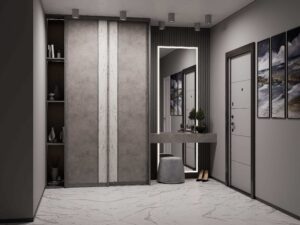 Встроенный шкаф-купе для гостиной или прихожей с матовыми серыми фасадами и лаконичны...
